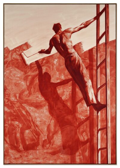 In this majestic work Tansey depicts a modern painter standing on a ladder and wielding a paint roller across what appears to be Michelangelo’s famous mural, The Last Judgment in the Sistine Chapel. Having already obliterated the heavenly host, the painter’s broad washes are now sweeping across the torso of the commanding figure of Christ, whose upraised hand – the hand with which he saves damns souls – has already disappeared. Like Michelangelo’s image of Christ, the painter on the ladder is a bare-torsoed man of action, vigorously redeeming or condemning with his brush.