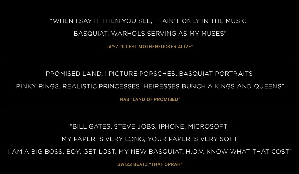 The musical vein runs not only through Basquiat’s life and work, but also in his legacy as a source of inspiration and influence for music artists today. In the way that Basquiat lionized Parker in Now’s the Time, generations of hip hop artists, from JAY-Z to Nas, routinely namecheck Basquiat not only as a stylistic reference, but as an aspirational symbol given the artist’s vaunted place within the cultural pantheon. In the years since Basquiat’s death, his art and legacy have become firmly ensconced in the cultural mainstream and continues to inspire artists outside the bounds of painting with his genre-defying style.