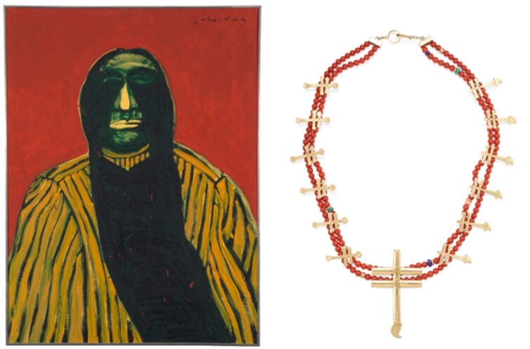 Los Angeles – On April 30 in Los Angeles, Bonhams’ Modern Native American Art and Jewelry sale will feature an impressive selection of works by established as well as up-and-coming Indigenous artists such as Fritz Scholder, Oscar Howe, Jaune Quick-To-See Smith, Charles Loloma, Rose Simpson, Rhonda Holy Bear, John Nieto, and Jesse Monongya. The sale will be highlighted by several works from Luiseño painter and colorist, Fritz Scholder (1937-2005) including Dartmouth Portrait #3, 1973, estimated at $100,000 – 150,000. Painted while an artist-in-residence at Dartmouth College, the oil painting of an Indigenous man against a bold red background was one in a series which brought Scholder to the attention of the wider art world.