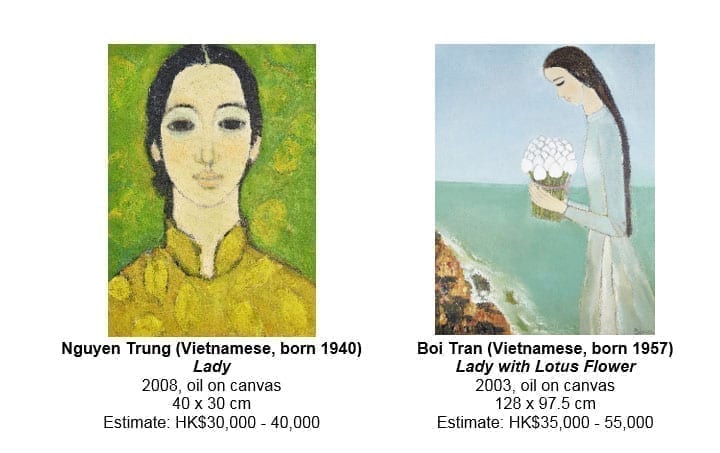 This group of works is led by Hanoi (pictured front) by French artist Alix Aymé, who had travelled in and painted extensively in Asia. The painting features a classic street scene with a Vietnamese mother strolling along a path, her baby nestled by her hips, as the city Hanoi – depicted by Aymé as a verdant sub-tropical paradise – comes into spring. Created in the 1920s during the artist’s first sojourn in Vietnam, Hanoi is one of her earliest paintings and a rare oil-on-panel example to come to the market.