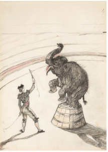 Les Trois Juges by Daumier (estimate: $ 300,000 – 500,000) comes from the artist’s celebrated series exploring and critiquing the dynamics within the courtroom. Toulouse-Lautrec’s Au cirque: Eléphant en liberté (estimate: $400,000 – 600,000) depicts an elephant on hind legs reacting to the commands of its trainer in costume, comes from the limited series of just 50 works by the artist produced in 1899 during his time confined to the Folie Saint James asylum in the suburbs of Paris.