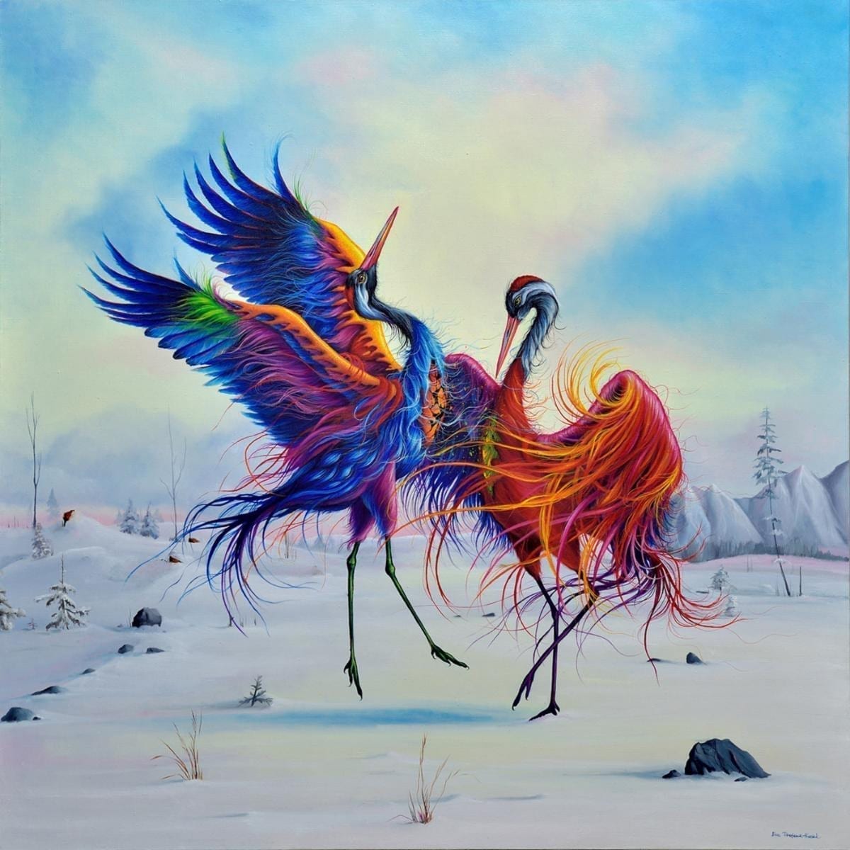 Pro?czuk-Kuziak’s oil paintings are a combination of still life, nature and fantasy. She creates rainbow-colored visions of animals that are made of materials, as if woven out of thread and decorative fabrics. Building on contrast, they are full of life, energy, and fantasy, always idealized in their complicated nature and continuous transformation. In her works, Ewa uses intensely saturated colors, which illustrate the vibrancy of the world her characters inhabit.