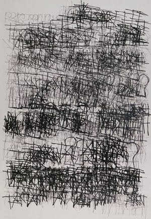 Dan Miller will be represented by a large scroll drawing. His artwork is composed of obsessive overlays of words and imagery that often build to the point of abstraction. Each work contains a written record of Miller’s interests in hardware stores, light bulbs, electrical sockets, and familiar people; however, only a few words are identified in its final stage. Largely unable to speak, Miller was taught at an early age to write words and numbers in order to communicate. This became the primary influence on his artistic practice, transforming text into graphic elements and employing an abstracted visual language as a tool of inquiry and expression.