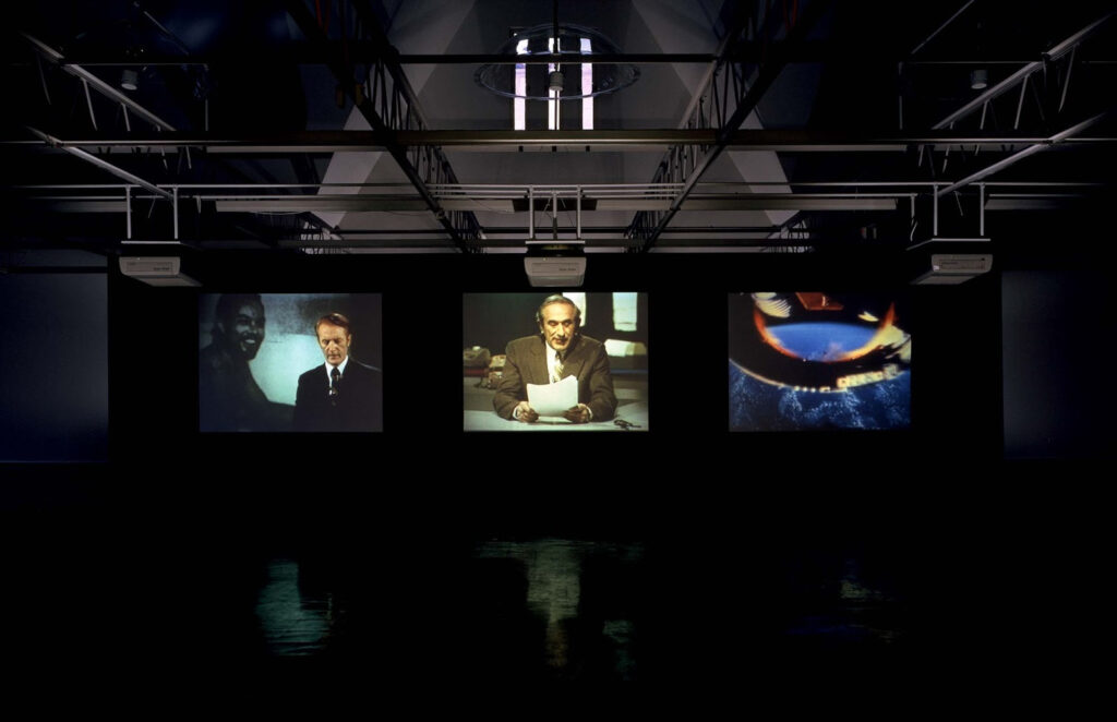 Evening (1994) is one of Douglas’s earliest multichannel installations. In the work, the artist looks at the transformation of television news broadcasts, a medium that was overtaking radio as the primary conduit of information distribution in the 1960s. Commissioned by the Renaissance Society, Chicago, the work reconstructs newscasts from two different nights in the city—January 1, 1969 and January 1, 1970.