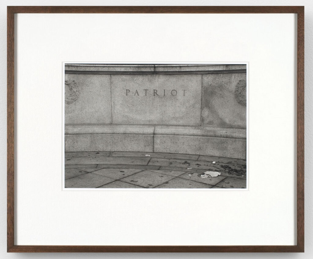 The present work comprises thirteen photographs, twelve of which are exhibited, each depicting a single word engraved on the memorial to Theodore Roosevelt that, until recently, stood outside the American Museum of Natural History in New York. Eliding the equestrian statue of the former president that stood at the monument’s center, the artist here isolates each of the heroic attributes that adorn the surrounding space.