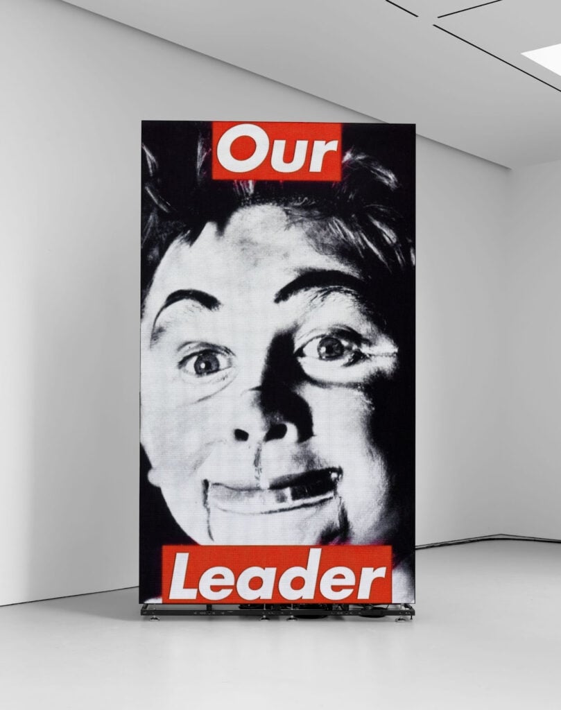 Untitled (Our Leader) (1987/2020) is an example of Kruger’s “replays,” a body of work begun in 2019 in which the artist reconfigures in new digital formats some of the most well-known examples from her own potent and incisive oeuvre. By revisiting and animating these works, the artist further questions established power structures and social constructs through images and text. The replays, which are augmented with striking sound effects, transform Kruger’s previously static images into dynamic video works that engage with the visual paradigm of the current moment. Here, the artist begins with her 1987 pasteup collage Untitled (Our Leader), which superimposes the titular patriotic phrase over the head of a glassy-eyed puppet. In the video work, the puppet’s vacant smile swirls into a grotesque distortion before settling again, followed by a range of new epithets—such as “Our Loser,” “Our Loner,” “Our Lender,” and “Our Lover”—that blare across the screen to the sound of a ringing bell.
