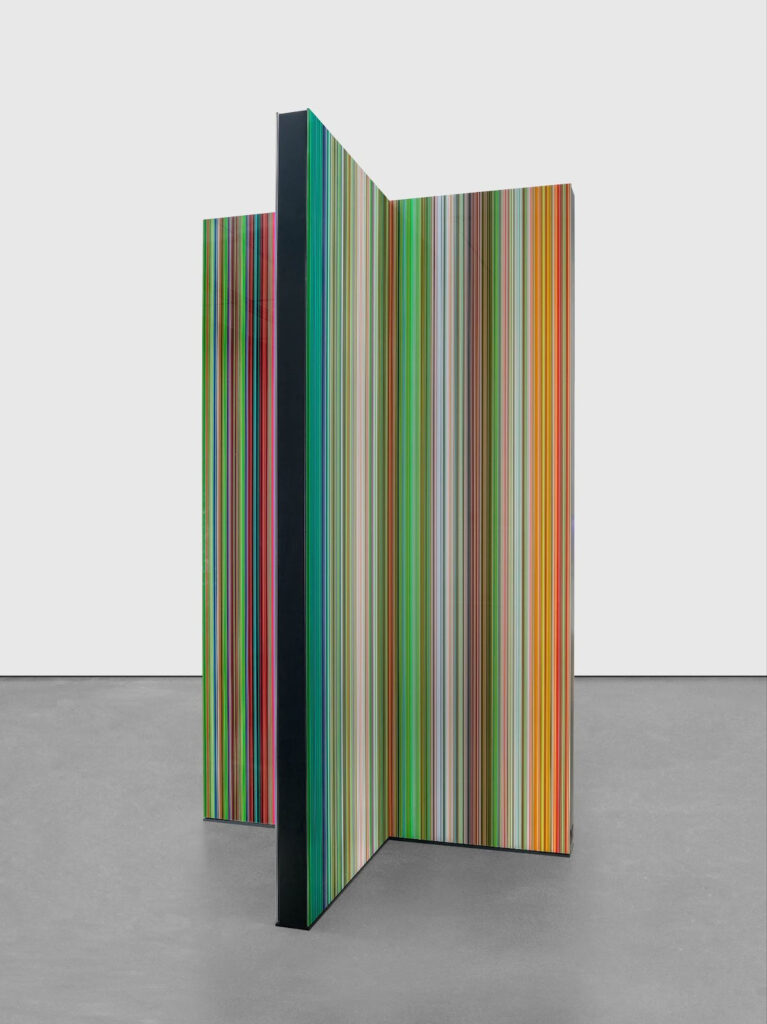 Since the 1960s, Richter has created large-scale sculptures using glass and mirrored surfaces, harnessing these materials’ reflective properties to explore the relationship between installation art and the built environment. His later freestanding installations—which date from 2002 onward and are constructed from groups of upright transparent panes—uniquely position the material of glass as a literal reflection on painting and image-making rather than as a form of pure sculpture. In STRIP-TOWER, for the first time, Richter applies a similar physical construction to his Strip (2011–2016) paintings, creating a sculptural manifestation of these abstract, digitally derived compositions that expands his uniquely analytical and experimental approach to the painted medium into three dimensions.