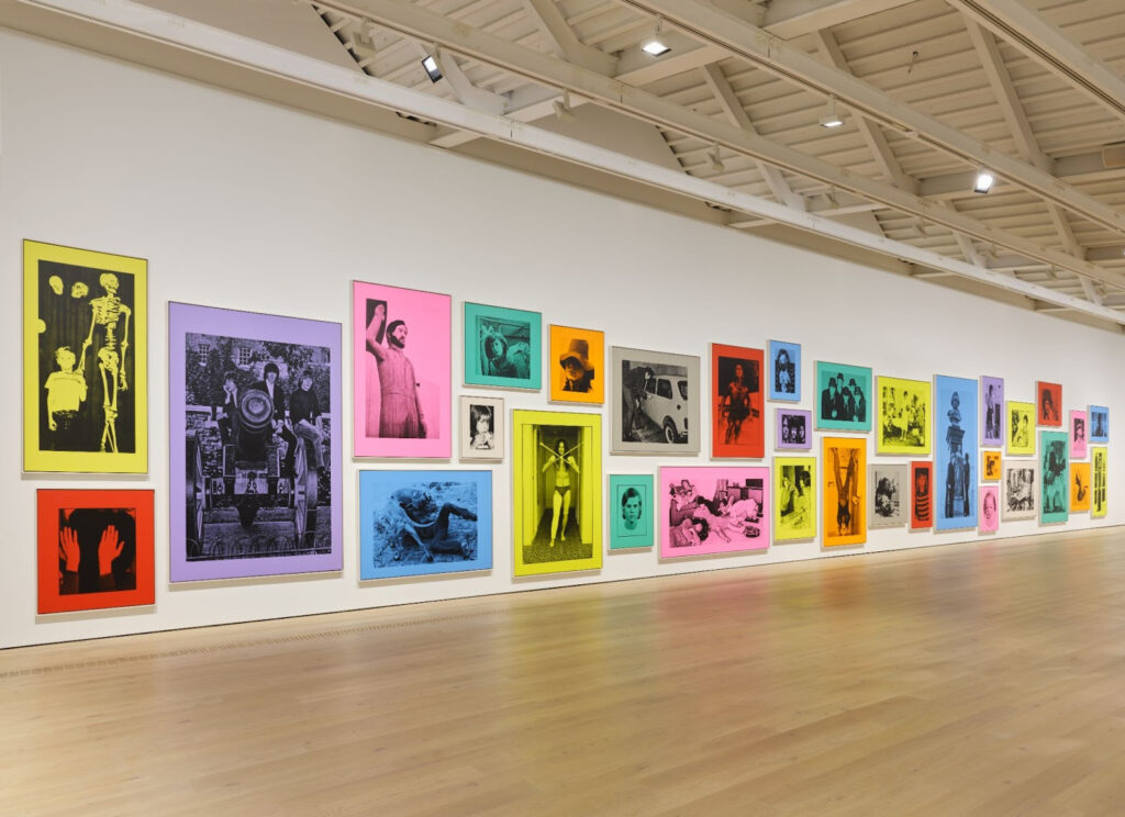 Sideshow Rigmarole (2020) is the artist’s largest installation to date and comprises thirty-three discrete elements that extend across the length of a gallery wall, bringing together images from clippings of magazines that circulated from 1970 to 1972. Shearer distills his selection of images by mostly choosing smaller black-and-white halftone images that were reproduced via offset on newsprint, instead of the glossy full-color pinup centerfolds or covers that often showcased celebrities.