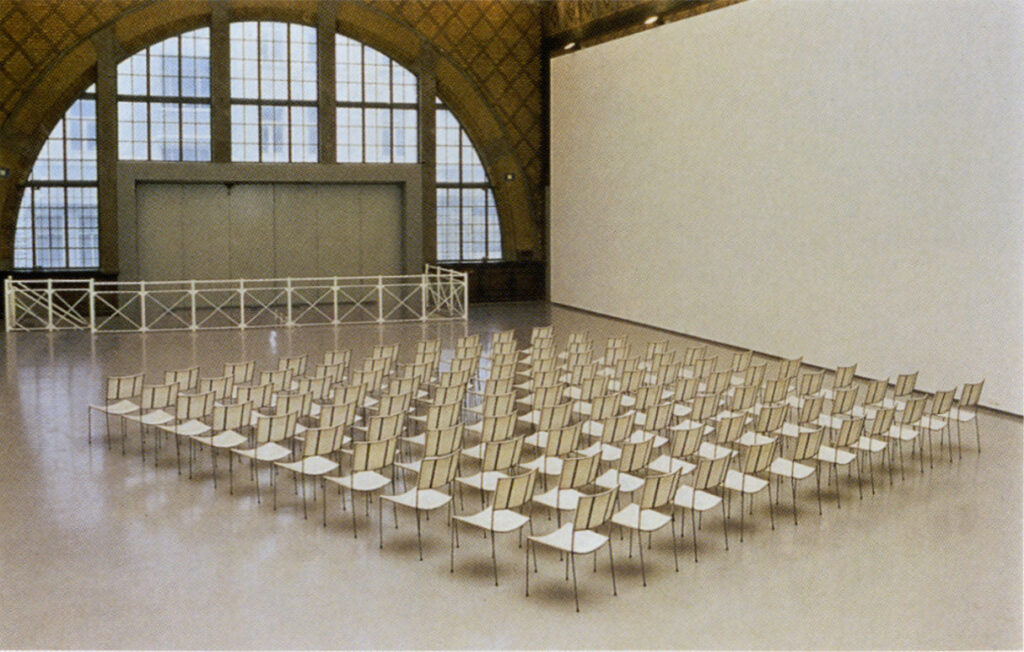 In the 1990s, West developed this concept further, executing several works that created variations on a lounge, cafe, theater, or lecture hall environment. A significant example of this body of work, 100 Stühle (100 Chairs) (1998), consists of 99 identical seats rendered in welded metal and dispersion, the hardened white appearance of which recalls West’s important Passstücke (Adaptives) of the 1970s and 80s. Following on the temporary installation of colorful, patterned seats “100 Days – 100 Guests” that he devised for the lecture hall designed by Heimo Zobernig at Documenta 10 in 1997, the present work was debuted as part of West’s 1999 solo exhibition at the Rooseum Center for Contemporary Art, Malmö, Sweden. While the original installation at Rooseum had 100 chairs, as suggested by the title, the artist deliberately and playfully removed one of the chairs for posterity.