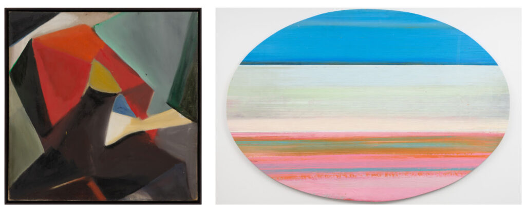 L-R: Ed Clark | Untitled | 1955 | Oil on canvas 129.5 x 129.5 cm/51 x 51 in | ©The Estate of Ed Clark | Courtesy of The Estate of Ed Clark and Hauser & Wirth ; Ed Clark | Untitled | c. 1970s Acrylic on shaped canvas 292.4 x 406.7 cm / 115 1/8 x 160 1/8 in | Photo: Frederik Nilsen | ©The Estate of Ed Clark | Courtesy of The Estate of Ed Clark and Hauser & Wirth