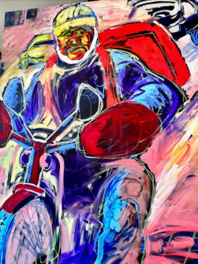 Through a female lens, Leonovich’s garish, bold, confrontational, confident and empathetic paintings, skillfully reveal the essential aspects of her male subjects’ humanity and diversity.  While not overtly sexual, the paintings have symbolic allusions to sex and desire. “I like men, I prefer to paint them,” says Leonovich.
