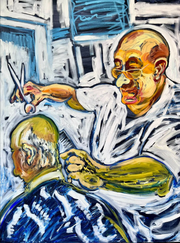 Katya Leonovich, Barber, 2023, oil on canvas, 60 x 48 inches