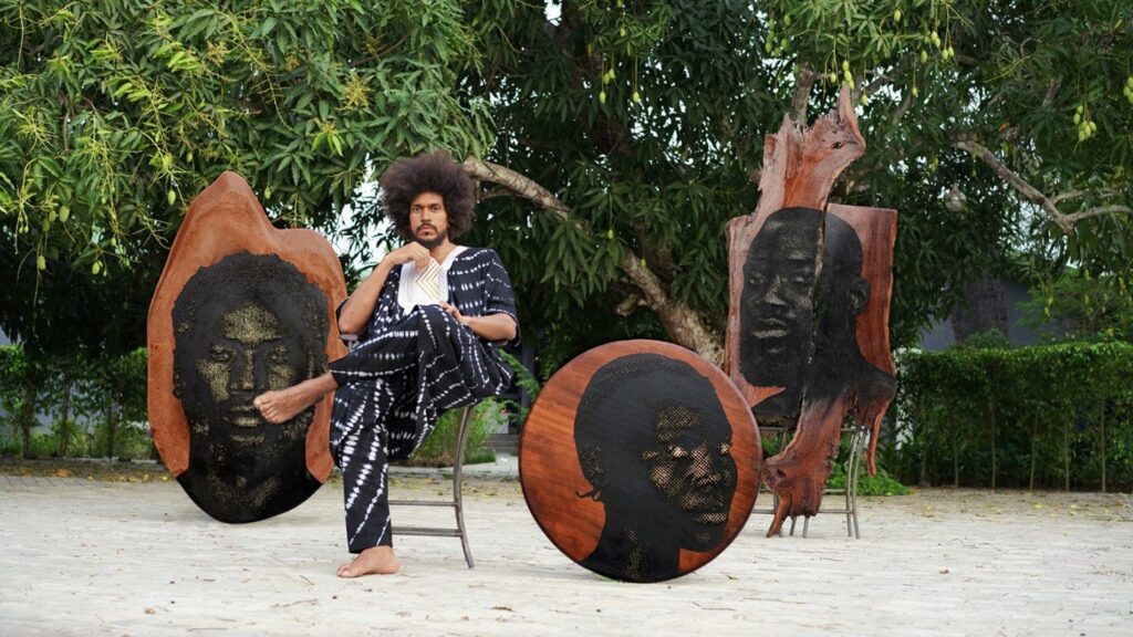 Alexis Peskine reflects his own compound, multi-cultural heritage by making work in a variety of places, as he travels the world to take up residencies in Senegal, Brazil, Angola, Italy and Cameroon. A selection of the signature gold leaf on nail ‘portraits’ created by this actively peripatetic artist, in a recent visit to Florence, will be shown.