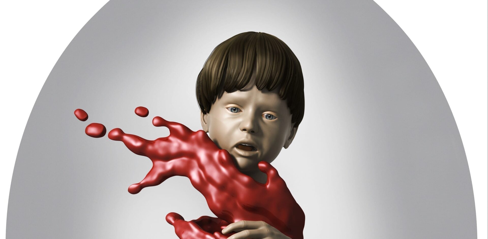The objects are surrounded by inkjetprints showing computer generated imagery. All the pictures depict children confronted with waves of red water. Or maybe it is the blood that is spilled in the act of angling? The waves assume strange shapes that the children cann’t cope with. In one of the pictures the water even looks like a face that seems just as frightened as the children themselves.
