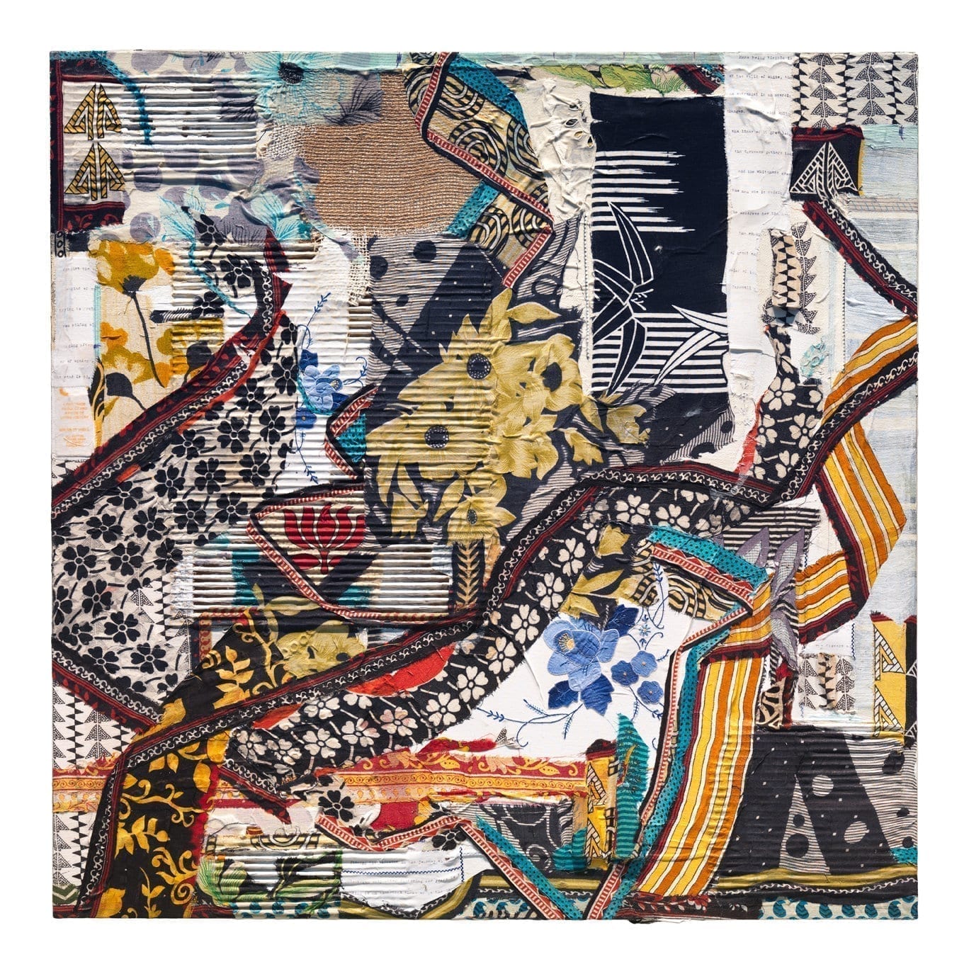 Though abstract in essence, elements of the paintings—the twisted, torn, dignified pieces of fabric—depending upon one’s own past or current vantage point—might evince flowing rivers, flamboyant vegetation, towering totems, shadows, structures or intimate passageways. Everywhere one turns, the humble becomes incantatory.