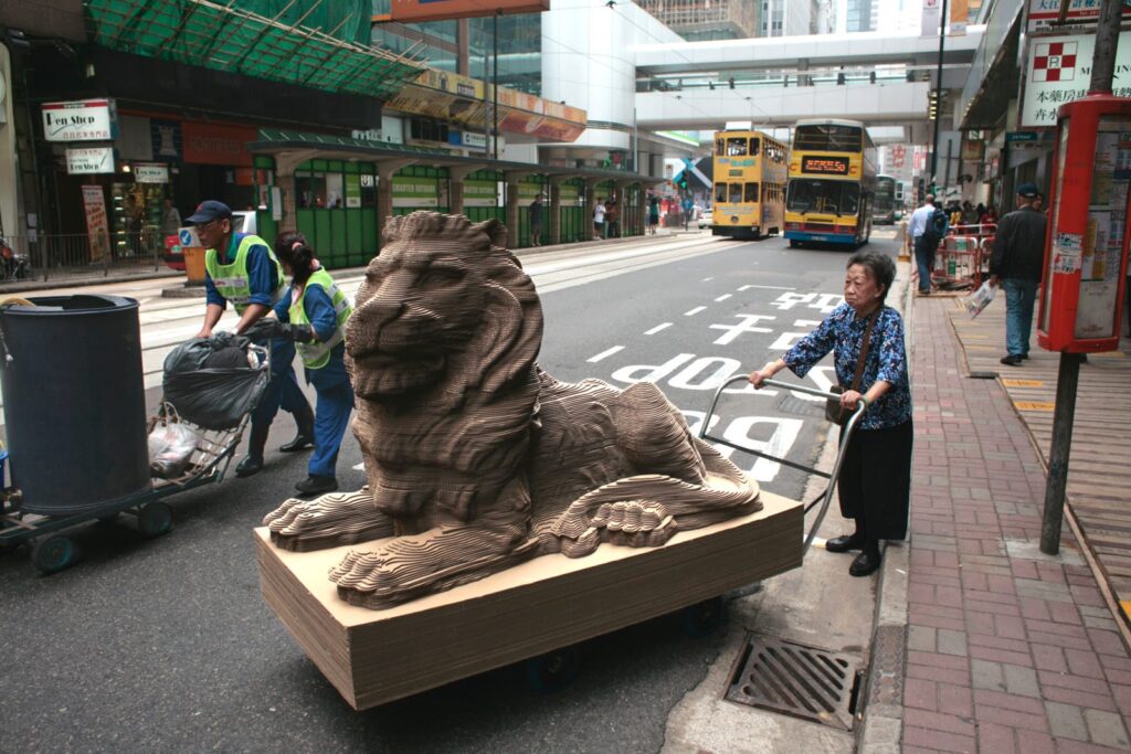 Also on view in the central atrium throughout the whole programme are the works of three Hong Kong artists restaging the sensorium of alienation, absurdity, and abeyance experienced all too intensely in the city. Yuk King Tan’s Scavenger (2008) documents the performance of street recycler Lam por por who carts a life-size cardboard model of the HSBC Lion. She laboured the heavy symbol of colonialism down the crowded arterial pedestrian way of Central. Her journey embodies the ruthless late-capitalistic logic of recycling and upcycling, freelance and precarity, scavenging and salvaging in the imminent ruin of another ordinary financial crisis. Eason Tsang Ka Wai’s t o u c h (2019) records the artist’s repetitive process of dropping a white glove onto a glass screen. Only the split moment the glove touches the screen remains visible, its slapping arrhythmia a startling signal unpredictable to the most vigilant of viewers. Impossibly, the ultra-thin (infra-mince à Duchamp) screen becomes the closest distance between the virtual space behind the video display and the real world where audience locates. Luke Casey’s House Of A Thousand Assholes (2022) witnesses the journey of a suitcase-carrying Cantonese protagonist departing from Jardine House (the eponymous multiple-orificed skyscraper), wearily rising to the peak via the Midlevel outdoor escalator, and manically descending into the watery depth of Shek-O beach. Resolutely not returning, he personifies a new wave of sojourners emigrating in search of hope, freedom, and perhaps dignity.