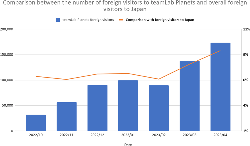 In addition, the number of international tourists visiting teamLab Planets exceeded 170,000 in April 2023.The monthly number of foreign visitors to teamLab Planets has reached a record high since its opening in July 2018.