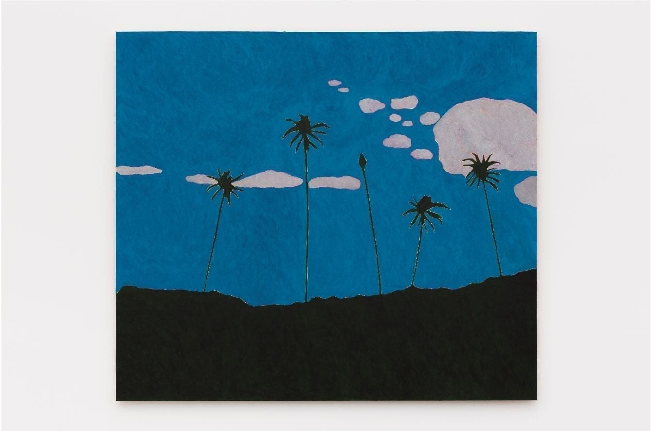 Leite lives and works in Belo Horizonte and travels regularly around her home country, absorbing the varied landscapes that influence and inform her work. Her paintings are often devoid of figures, depicting instead the rural scenes she first captures with her iPhone, which are then filtered through her imagination. These settings are brought into painterly life through abstracted shapes and fragmented vistas in hyper-saturated, hallucinatory colours, creating a specific mood and atmosphere within each image.