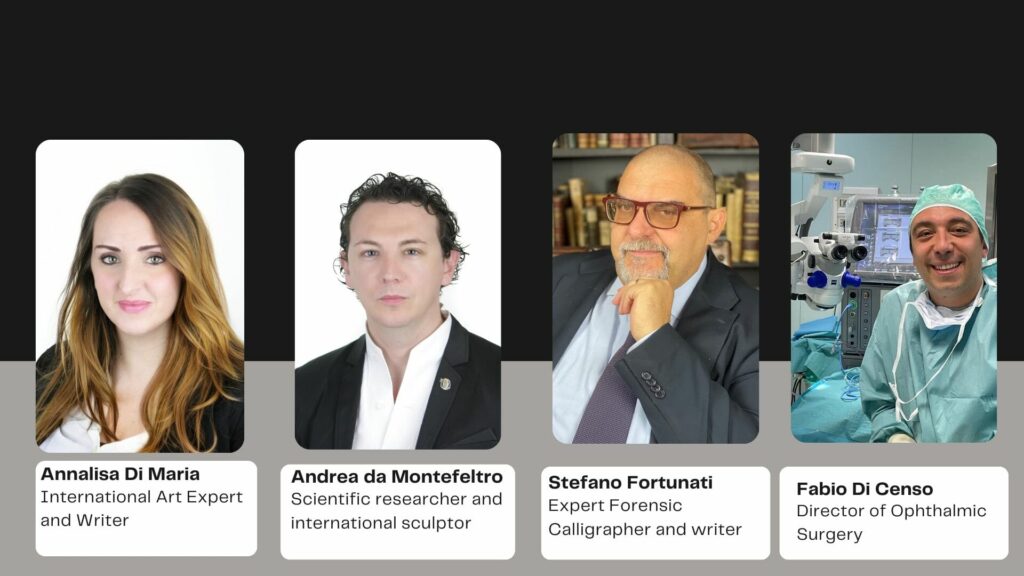 The refinement of this research was conducted by a multidisciplinary team of experts who, making use of science, brought their skills in order to be able to tackle such a complex study. The writer and international art scholar Annalisa Di Maria intervened in the study, considered one of the leading experts on Leonardo da Vinci who claims “In truth, the occasions in which Leonardo may have drawn the Duke are various, the profile is executed in red pencil with a not very thin tip. In the sheet Leonardo shades the hat, the cheeks, the chin and the eye socket. The direction and pressure of the hatching changes within the sketch, according to the type of Leonardo’s hatching, which has been demonstrated by recent studies, how much Leonardo used both hands to paint and draw according to the movement that the latter wanted to give to the his figures”. The international researcher and sculptor Andrea da Montefeltro, signatory of the find, intervened in the presentation, highlighting the indispensable role of the symbol at the basis of even the most hidden contents in Federico’s court. “The investigation carried out not only revealed that the drawing represents a subject with a missing right eye, but also the fact that the left one was healthy. Therefore Leonardo’s will to have represented Duke Federico from the right side, the side from which the Duke did not want to be represented, this is proof of Leonardo’s character and will to always follow his inspiration and to distinguish himself from all the others artists”. The Forensic Calligraph Expert Dr. Stefano Fortunati intervened in the calligraphic study of Leonardo’s handwriting and of the artefact, determining his intervention for the study of the Tuscan genius’s calligraphy. Who states “The drawing is certainly disconnected from all the elements written on the other side of the sheet and above all prior as a historical period”. Dr. Fabio Di Censo, ophthalmologist and director of the ophthalmology operating unit in Sulmona, intervened for the anatomical study, who confirmed in his report that the subject represented in the drawing under study had a missing right eye, as Federico da Montefeltro and therefore it was not a matter of a sleeping subject or a representation of a funerary mask as hypothesized up to now.