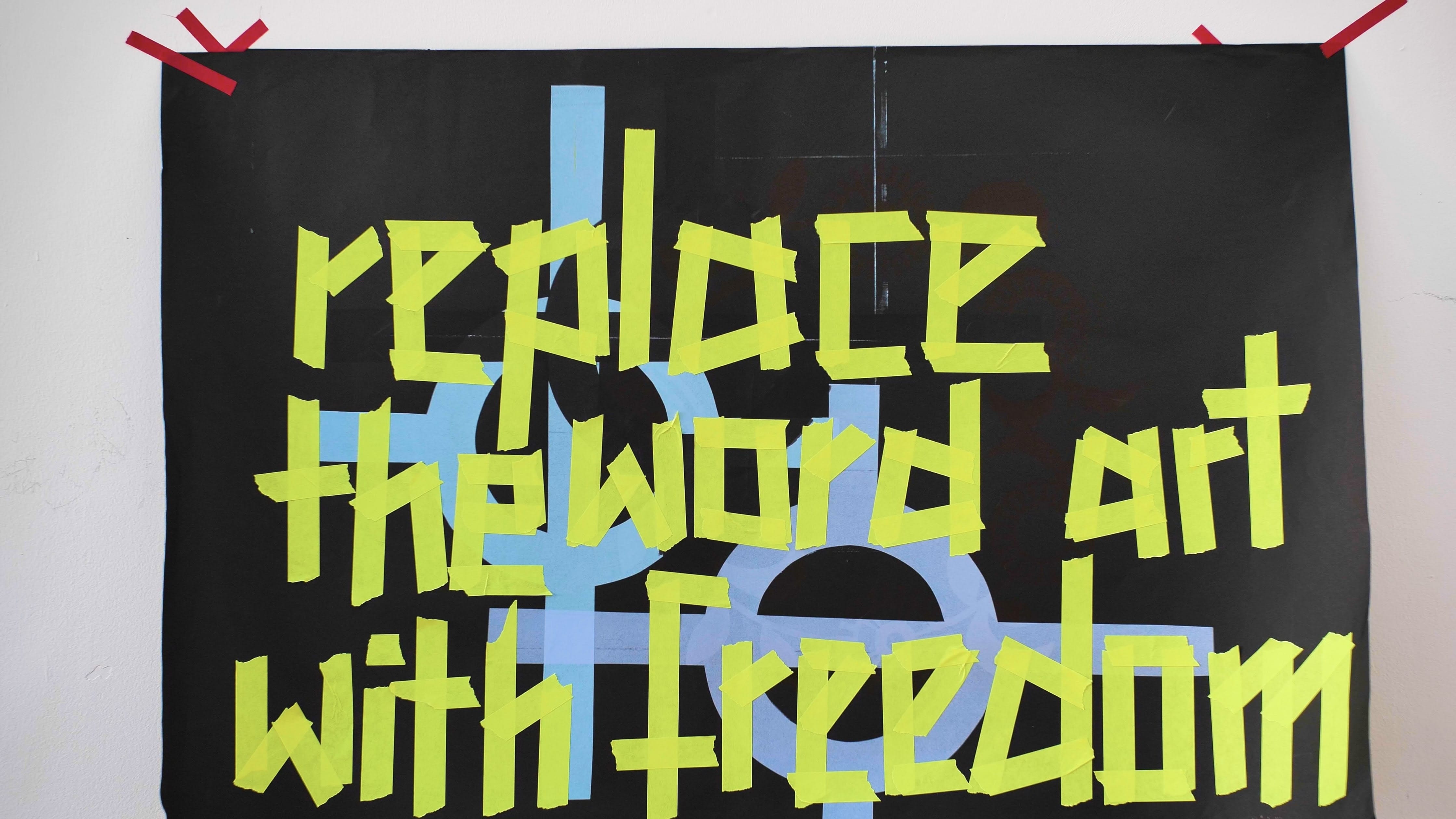 Working with local communities, Kathrin Böhm produced the first iteration of a three-year programme of rotational banners at Tanner Lane, Paddington. Responding to the overarching theme of ‘care’ led by The Showroom, the Tanner Lane Rotational Commission is part of the Paddington Square Public Art Programme. With this large-scale work, Kathrin Böhm responds to the theme of care by asking, ‘why do we care about art?’. The artist gathered the responses from the participants of collaborative poster-making workshops throughout July-October 2021. Böhm has designed the banner at Tanner Lane with designers An Endless Supply.