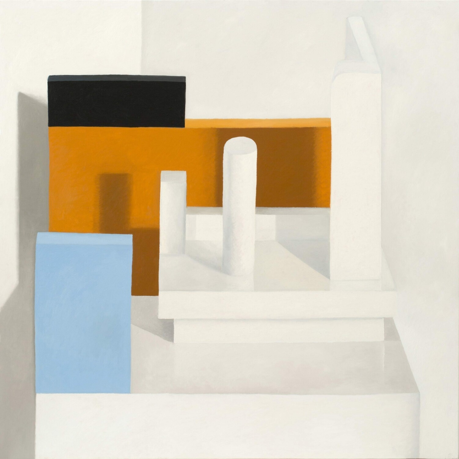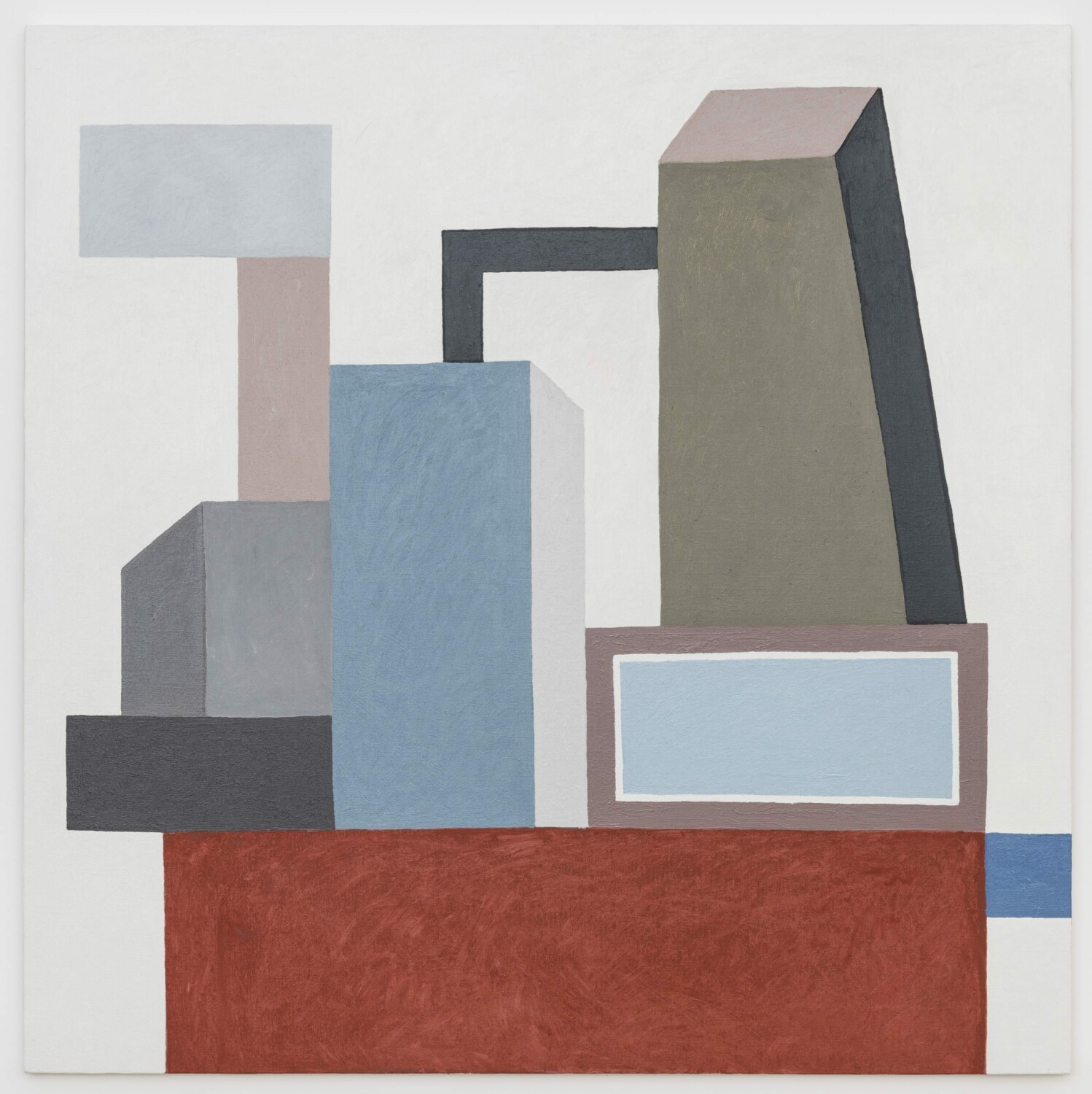 Since then, her main focus and passion has been painting. Over the past thirty-five years, Du Pasquier has been intrigued by the relationship between objects and the spaces in which they are installed. This ongoing investigation has manifested in paintings, sculptures, designs, patterns, constructions, carpets, books, and ceramics—constantly acting between the representational and non-representational, the tangible and intangible, reality and imagination, and two- and threedimensional forms. An expanded painter working between formats, Du Pasquier is open to new possibilities and experimentation, continuously playing with complex arrangements of forms. For a long period, she produced still life paintings following a precise methodology in combination with pure intuition: building sets with different elements—day-to-day objects first, handmade wood constructions later—and meticulously representing what was in front of her. Du Pasquier now works directly on paper or canvas, while building constructions that play with the juxtaposition of flat surfaces and three-dimensional objects. Her paintings can exist as objects, spaces, or environments, blurring the distinctions between a work and its inherent structures of display.