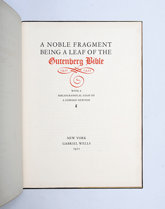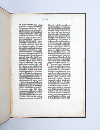 A single paper leaf from the Gutenberg bible, the first complete book printed with moveable type in Europe. This “Noble Fragment” originates from an imperfect copy of the Gutenberg Bible, lacking 50 leaves.