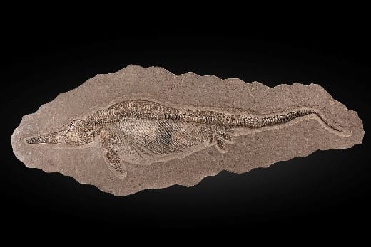 An exceptional Ichthyosaur skeleton (Ichthyosaur Leptopterygius quadriscissus) sold for €48,255 against an estimate of €40,000-50,000. A diapsid marine reptile that disappeared in the Late Cretaceous, this animal, whose fossil was found in the Posidonia clay of Holzmaden in Germany, is a fine example of the animals that inhabited the Jurassic seas. The present specimen is so well preserved that one can even see the remnants of its last meal behind the bar-like rows of slender ribs including fish, squids, and belemnites.