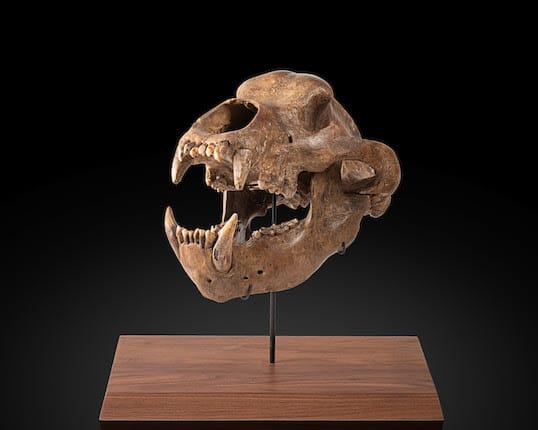 A skull of Ursus spelaeus ingressus, commonly known as the Cave Bear, a now-extinct species that lived in the Upper Pleistocene over much of Europe, from southern England to the Caucasus, was estimated at €5,000 to €7,000. It was sold for €24,225. This specimen, discovered in Austria and truly exceptional in its state of preservation and particularly in its dentition, won over the amateurs.