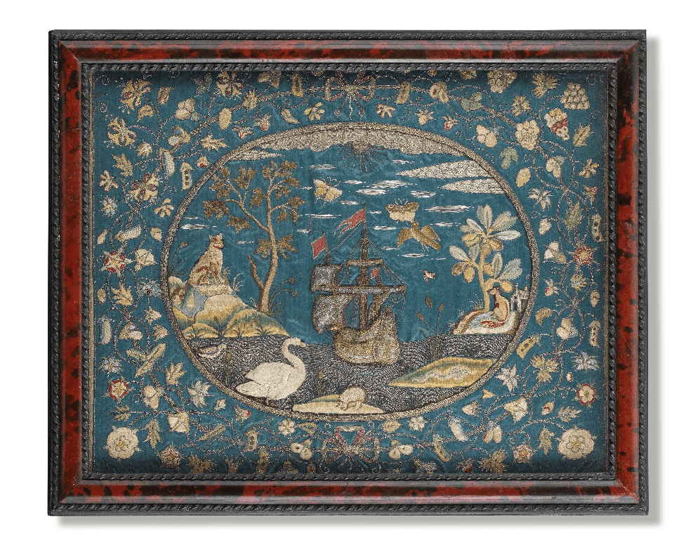 - A late 17th century English silk-embroidered silver and gilt-thread stumpwork picture. The central oval cartouche depicting a ship in full sail gliding through a narrow body of water, flanked by islands with animals, with insects and birds above and a swan, hedgehog and snake amongst the rushes in the foreground, all under a radiating sun, the scene surrounded by ribbon tied scrolling and fruiting tendrils and vines, on a blue silk ground, in simulated tortoiseshell frame. Estimate: £2,500-3,500.