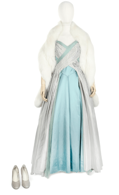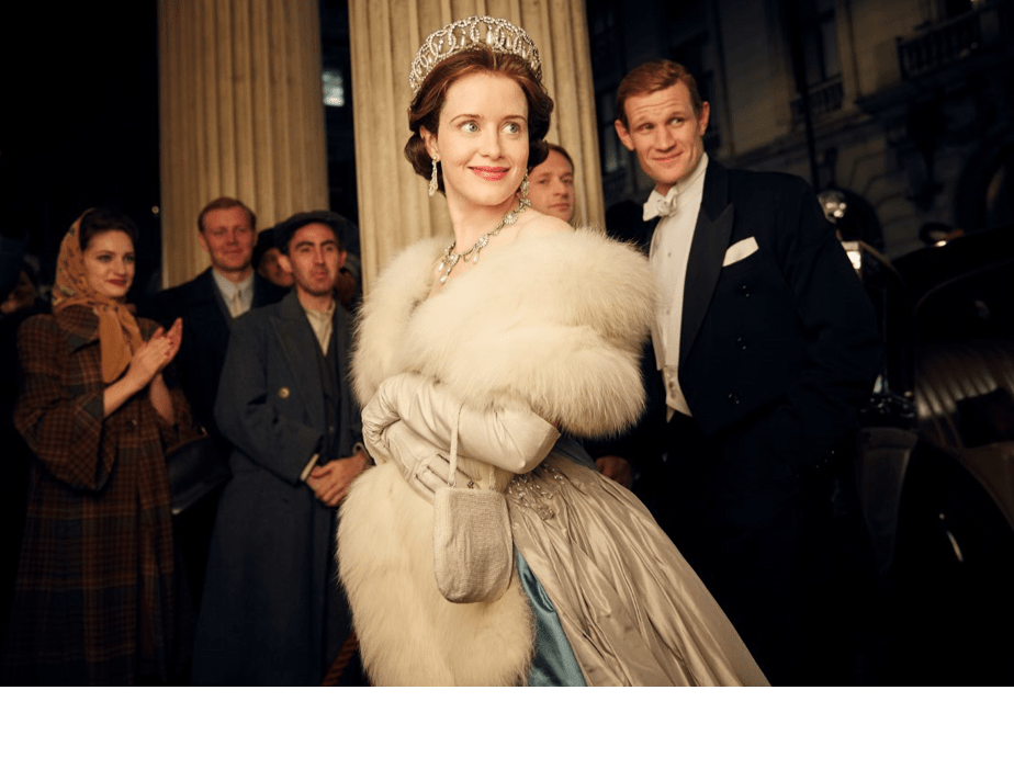- Claire Foy (as The Queen): Powder blue ballgown with pearl embellishment featured in the promotional poster with fur stole and grey leather court shoes. Season 1 Episode 5. Estimate: £5,000-7,000.