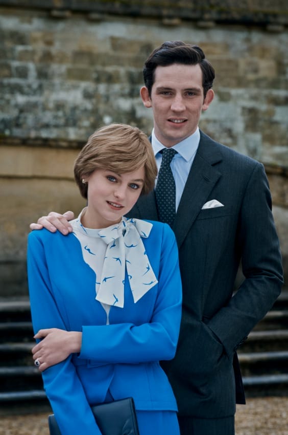 - Emma Corrin (as Lady Diana Spencer): Engagement announcement, a royal blue crepe skirt suit with pussybow blouse. Season 4 Episode 3. Estimate: £1,500-2,000.