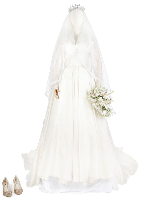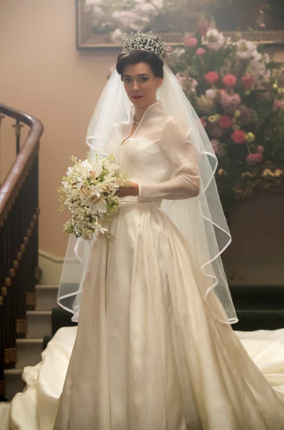 - Vanessa Kirby (as Princess Margaret): Full-length ivory wedding dress & veil with cream satin shoes. Season 2 Episode 7. Estimate: £6,000-8,000.