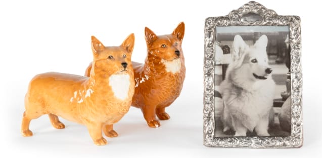 - Two Beswick porcelain models of corgis (17cm wide, 7cm deep, 14cm high) together with a silver mounted photograph frame, enclosing a black and white photograph of a corgi. Estimate: £200-300.